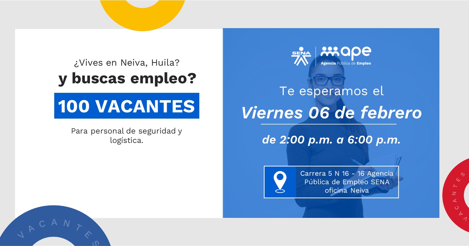 Lugar: Carrera 5 N 16 - 16 Agencia Pública de Empleo SENA oficina Neiva.