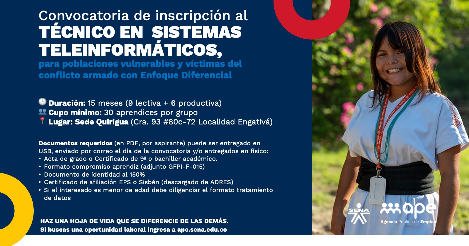 Convocatoria de inscripción al programa Técnico en Sistemas Teleinformáticos, dirigido a poblaciones vulnerables y víctimas del conflicto armado con enfoque diferencial.