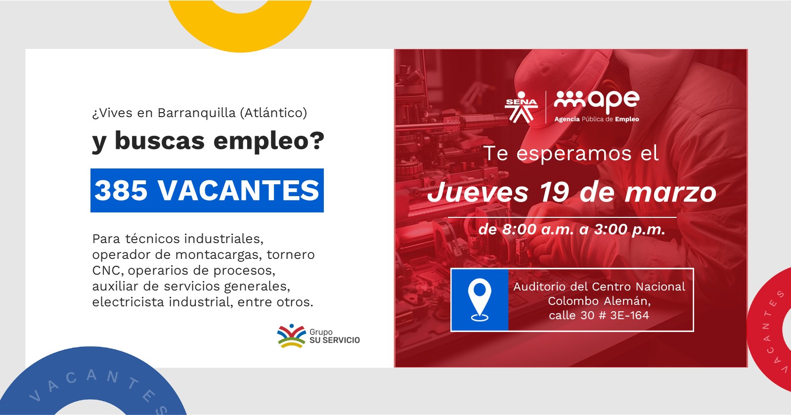 385 vacantes para técnicos industriales, operador de montacargas, tornero CNC, operarios de procesos, auxiliar de servicios generales, electricista industrial, entre otros.
